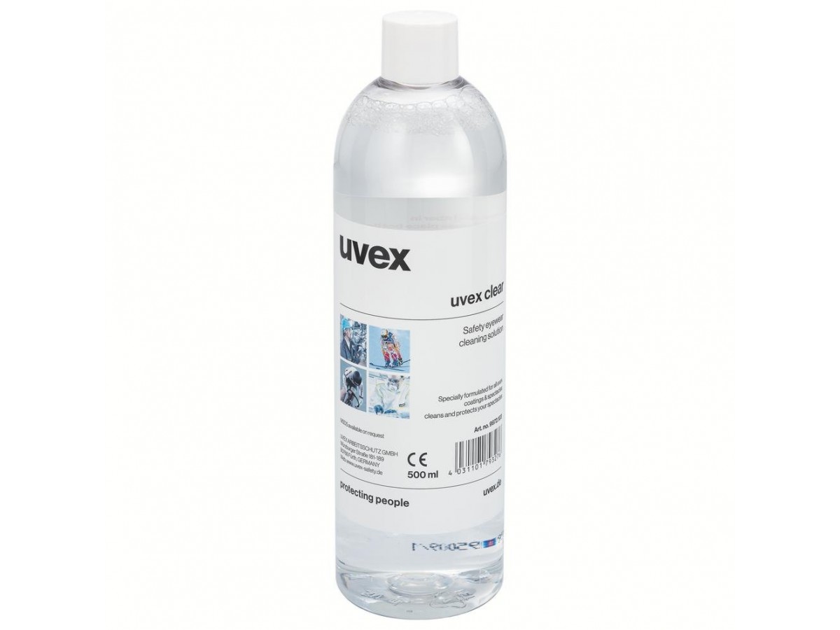 Жидкость легко удаляет загрязнения, пыль и отпечатки пальцев, помогая сохранять четкость обзора при работе. Удобный флакон объемом 500 мл подходит для использования в станции очистки очков uvex.