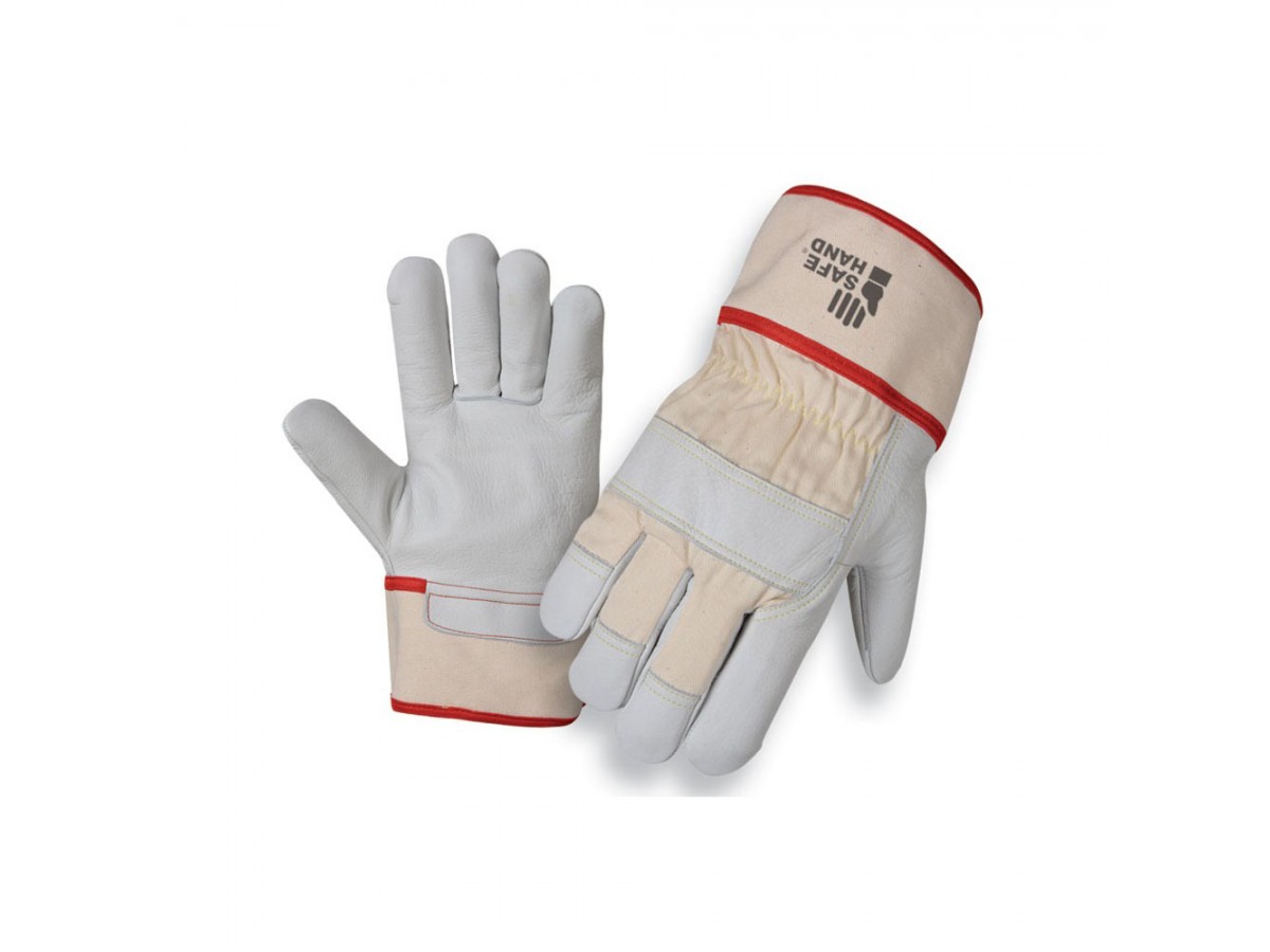 Комбинированные кожаные перчатки изготовлены из натуральной светлой телячьей кожи белого цвета и предназначены для защиты рук при выполнении различных производственных и строительных работ.