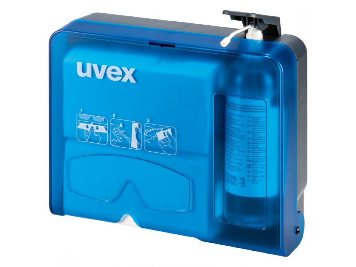 Станция для ухода за очками uvex обеспечивает простой и эффективный уход за защитными очками. С помощью специального очищающего раствора и салфеток линзы можно быстро очистить от загрязнений и пыли, сохраняя их прозрачность и не повреждая поверхность.